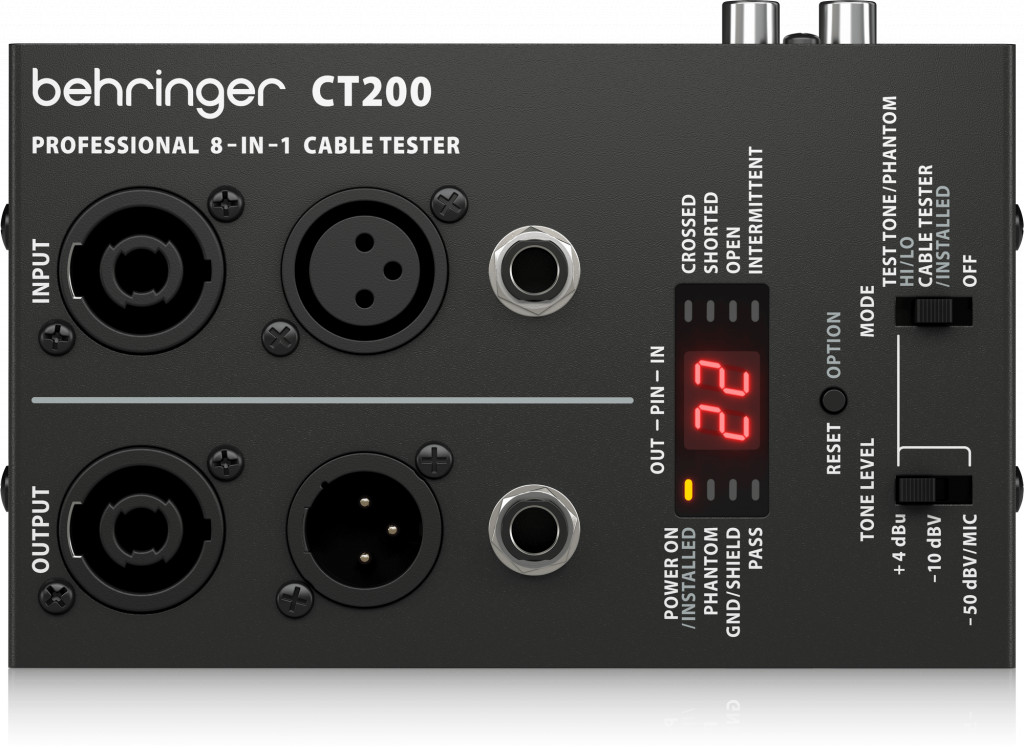 Tesztjelgenerátor: 1 kHz vagy 440 Hz +4 dBu-ra, -10 dBV vagy -50 dBV
