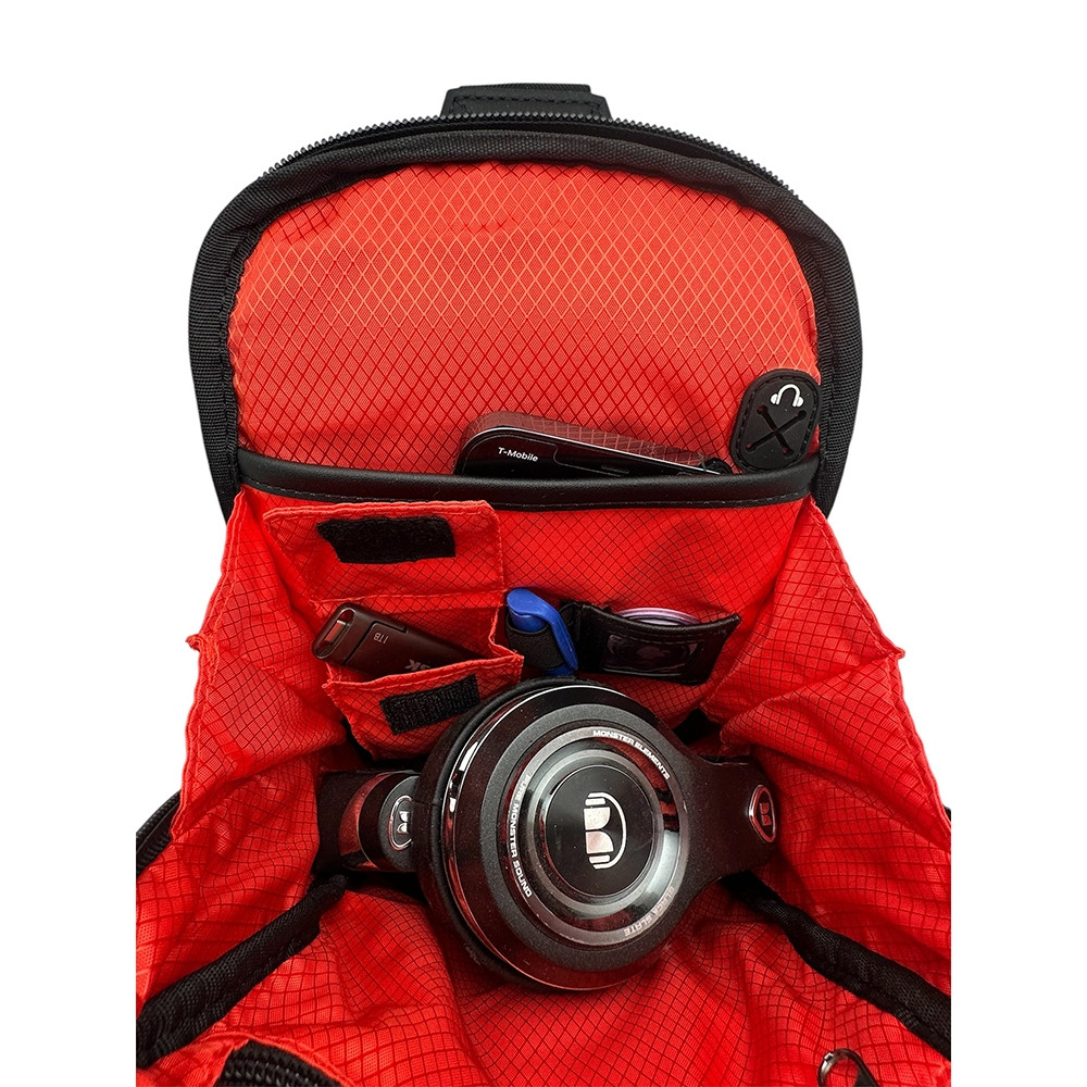 A "Pulse" egy multifunkcionális válltáska, amelyet a DJ-k mindennapi életéhez terveztek. Praktikus mindennapi táskaként is funkcionál. A sokoldalú fő rekesz különféle konfigurációknak kínál helyet, például fejhallgatónak, USB-meghajtónak, mini merevlemeznek, mobiltelefonnak vagy egy kis állvánnyal ellátott kamerának. Természetesen mindennapi feladatokhoz is használhatod, például telefon, pénztárca, kulcsok vagy power bank tárolására. Van egy elülső zseb, amelyet saját logóval szabhatsz személyre. Egy másik zseb a hátulján gyors hozzáférést biztosít. Az állítható vállpánt lehetővé teszi, hogy a táskát bal vagy jobb oldalon is viselhesd. A hátulján található kábelcsatlakozó lehetővé teszi a kényelmes töltést útközben. Ezenkívül a táska külön rekesszel rendelkezik AirTag vagy más nyomkövető eszköz számára, tollaknak és számos praktikus cipzáras zsebbel.