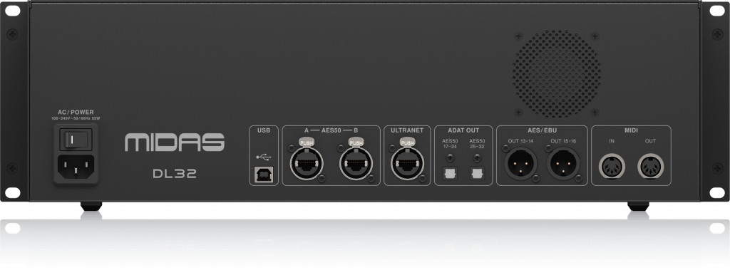 Egy komplett M32 rendszer részeként használva két DL32 színpadi box egymásba köthető a beépített AES50 portokon keresztül, így akár 64 mikrofon/vonal bemenetet és 32 szimmetrikus kimenetet is csatlakoztathatunk hozzá, az ULTRANET port pedig közvetlen csatlakozást tesz lehetővé a Turbosound iQ sorozatú hangfalakhoz és a Behringer POWERPLAY P-16 személyi monitorrendszerhez – amely akár 48 egyedi monitorkeverőt is képes meghajtani. Ezenkívül 2 optikai ADAT aljzatot és AES-3 (AES/EBU) csatlakozót is mellékeltünk külső eszközökhöz való csatlakoztatáshoz, egy kényelmes USB portot a számítógépen keresztüli rendszerfrissítésekhez – valamint MIDI I/O-t a világítási rendszerekhez és a hangmodul vezérléséhez.