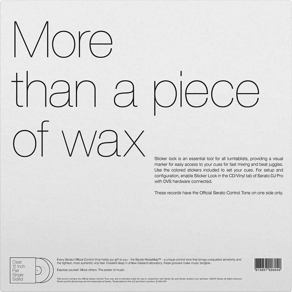 A Serato Sticker Lock sorozat ideális préselés lemezjátszósok, scratcherek és mindenféle bakelit előadó számára. A bakelit csak egyoldalasan van préselve, a vezérlőhanggal ellátva, így nagyon könnyű. A préseletlen oldal a mellékelt matricajelölőkkel bevonható, így pontos vizuális kontrollt biztosít a scratchelés, az ütemzsonglőrködés és a cue pontok kiváltása során.