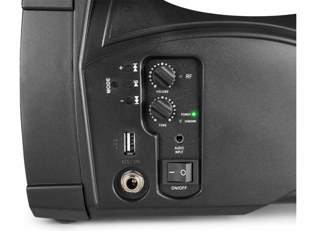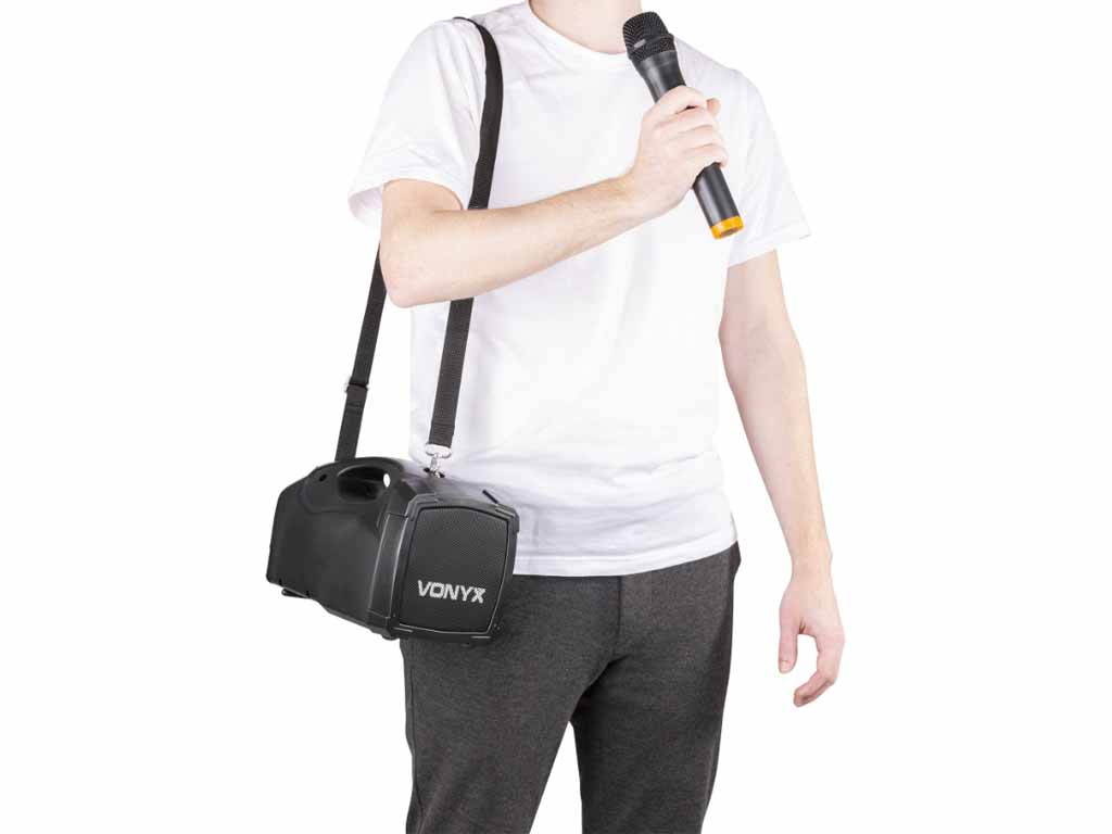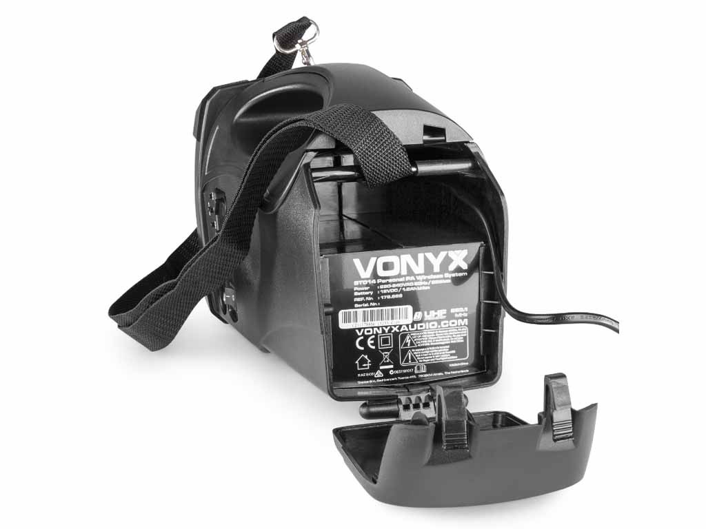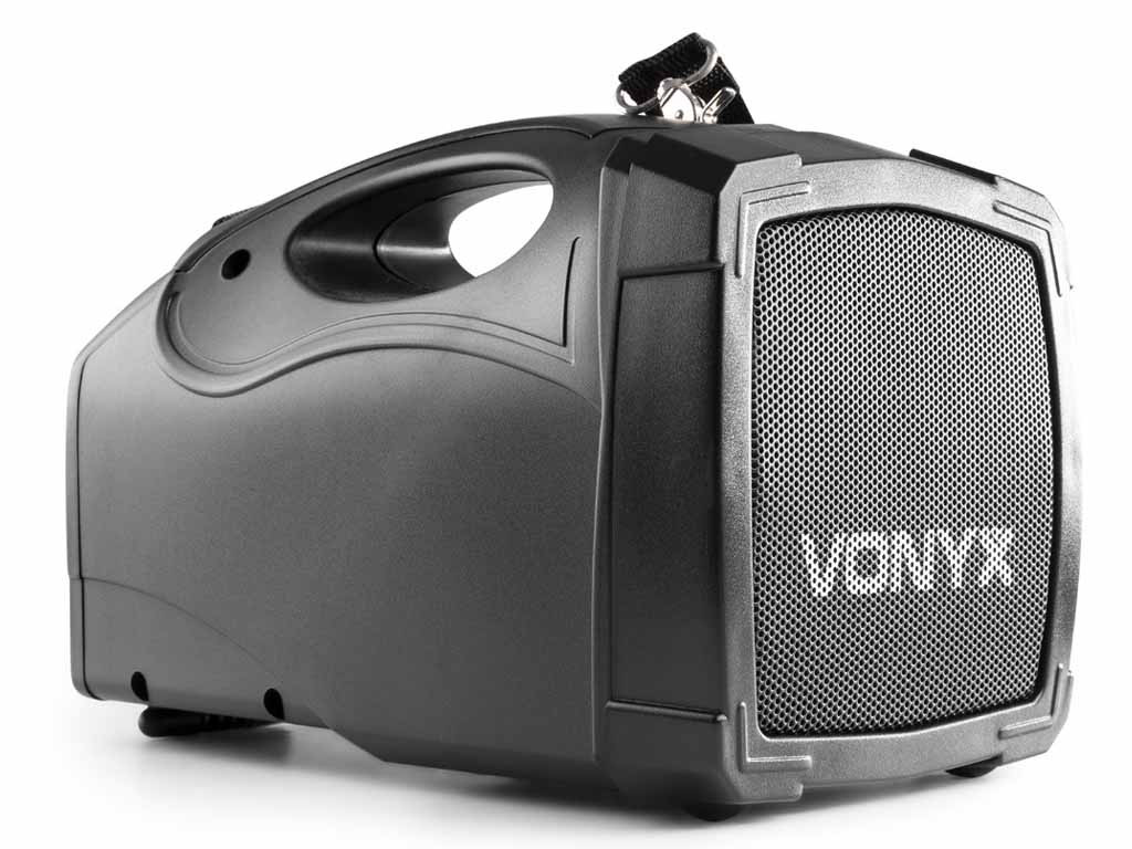 A Vonyx ST-014 a gyártó egyik legkisebb, kifejezetten beszédhangosításra kifejlesztett hordozható hangfala. Beépített akkumulátorral rendelkezik, egy töltéssel átlagos felhasználás mellett akár 3-5 órán keresztül is használható. A hangfal az emberi hang frekvenciatartományát tudja megfelelő minőségben megszólaltatni, nem zene hallgatásra tervezték, de alkalomszerűen, ünnepségeken egy-egy zene, himnusz lejátszása nem okoz neki problémát. A termék beépített USB MP3 lejátszóval rendelkezik, képes pendrive-ról MP3 zenék lejátszására. A lejátszó egyben BLUETOOTH vevő is, amire akár laptoppal, akár mobiltelefonnal tudunk csatlakozni. A Bluetooth kapcsolat segítségével megoldható, hogy a telefonunkon lejátszott zene kábeles kapcsolat nélkül szólaljon meg a hangfalon. A Bluetooth hatótávolsága 3-5 méter. Beépített trafóval rendelkezik, ennek köszönhetően hálózatról is használható, a töltés is ily módon történik, a maximális töltöttséget egy LED jelzi. A szett tartalmaz egy vezeték nélküli mikrofont is, melynek vevője a hangfalba van építven ezen kívül egy nagy Jack bemeneten keresztül további mikrofont köthetünk rá. 2,2 kg-os tömegével szállítása nagyon egyszerű valamint ideális kialakításának köszönhetően könnyedén kézben tartható a használata során. Ajánlani tudjuk elsősorban beszédhangosítási célokra, idegenvezetőknek, iskolai rendezvények, beszédek hangosítására.