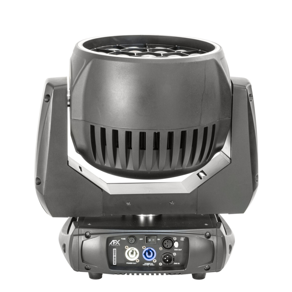 Méhsejt szerkezetű wash zoom forgófejes lámpa gyűrű-effekttel, 19 x 40W RGBW LED-del, flight case-ben.