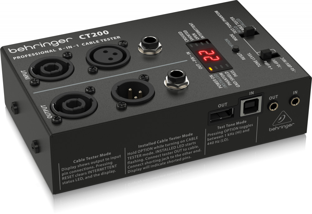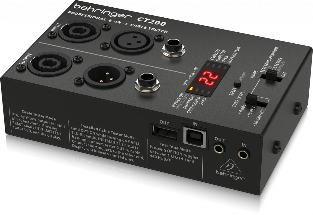 Tesztjelgenerátor: 1 kHz vagy 440 Hz +4 dBu-ra, -10 dBV vagy -50 dBV